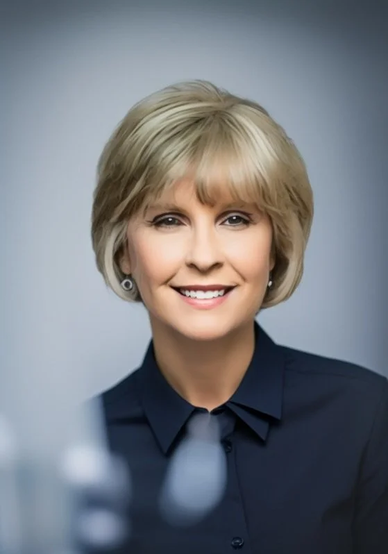• A smiling woman with short blonde hair, wearing a dark blue shirt and earrings, against a gray background.